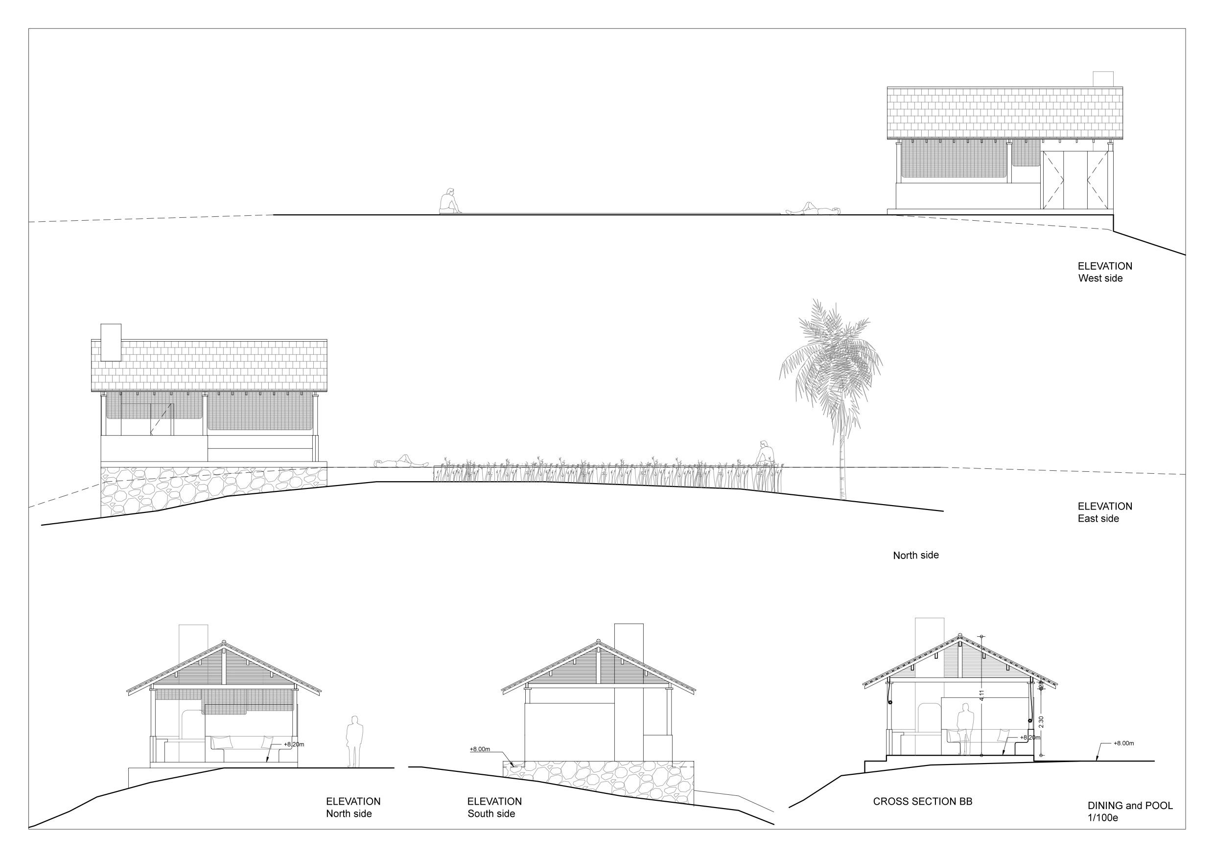 La piscine est implantée dans l'axe du chemin traversant les rizières qui sont protégées par le gouvernement et non constructibles. La topographie du terrain permet de la placer en contrebas du portique de la maison et de dégager la vue depuis la terrasse, en l'associant à un traitement paysager soigné.