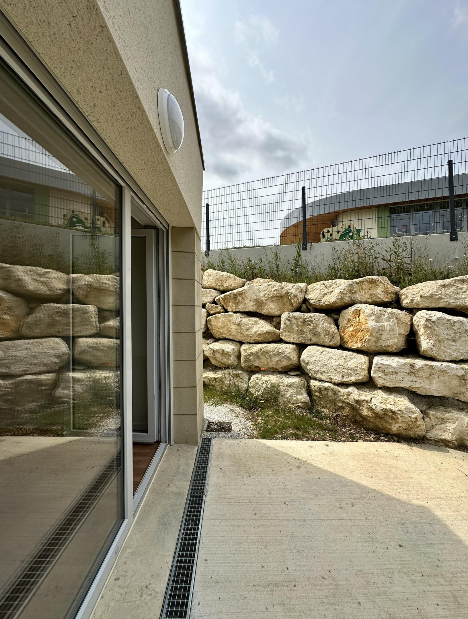 Pour les maisons individuelles seulement, la construction est réalisée à partir de blocs maçonnés biosourcés en béton de chanvre. Les façades sont revêtues d’enduit traditionnel à la chaux de teinte naturelle claire, en alternance avec des secteurs d’enduit matricé ton pierre.