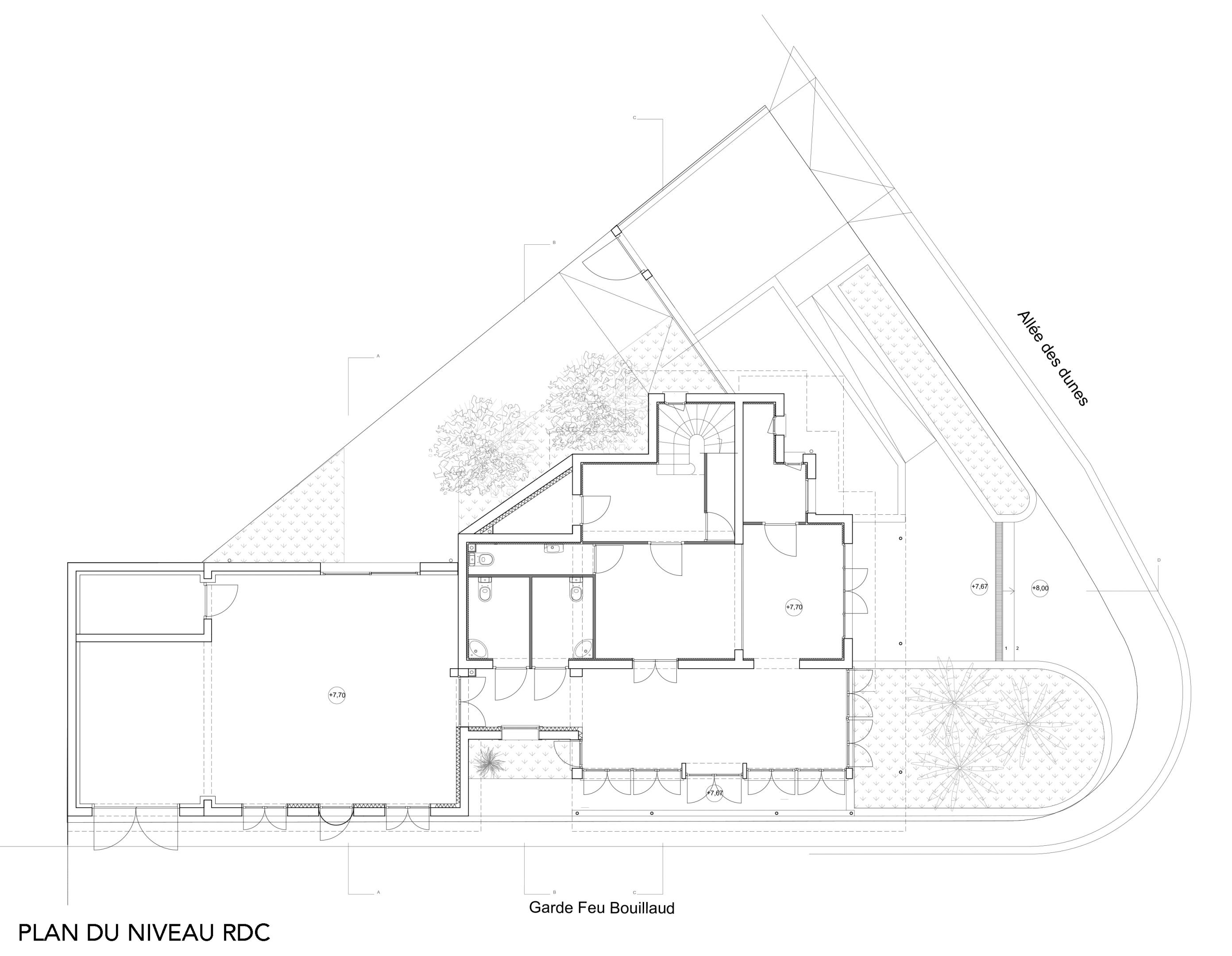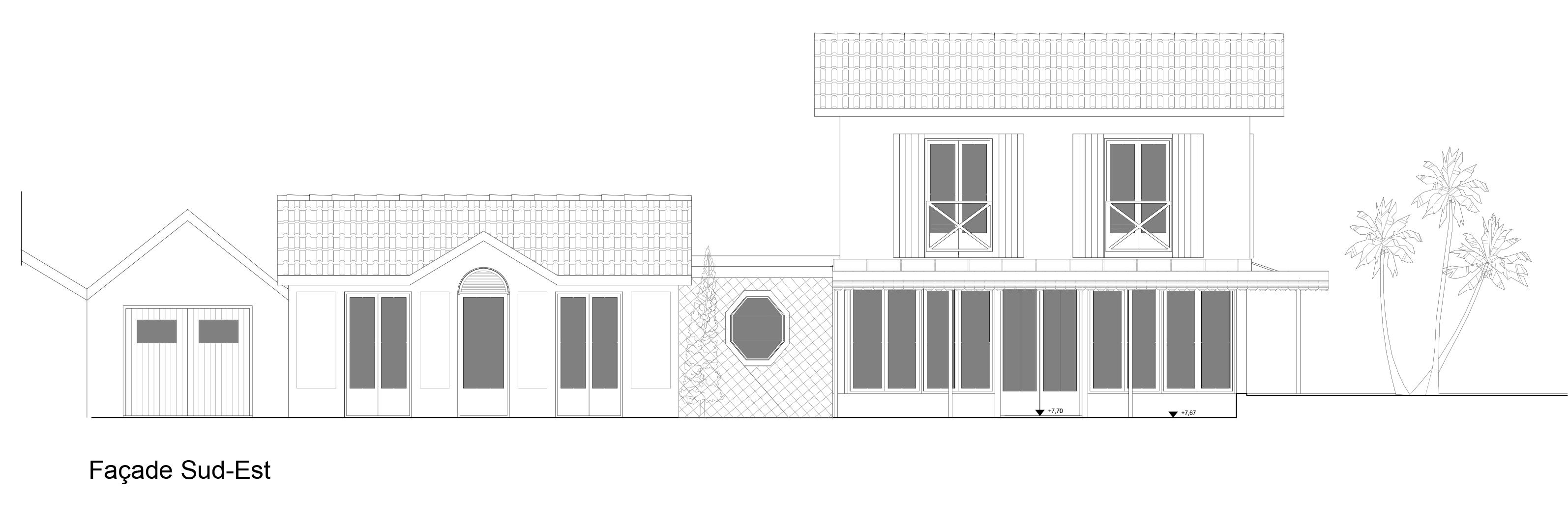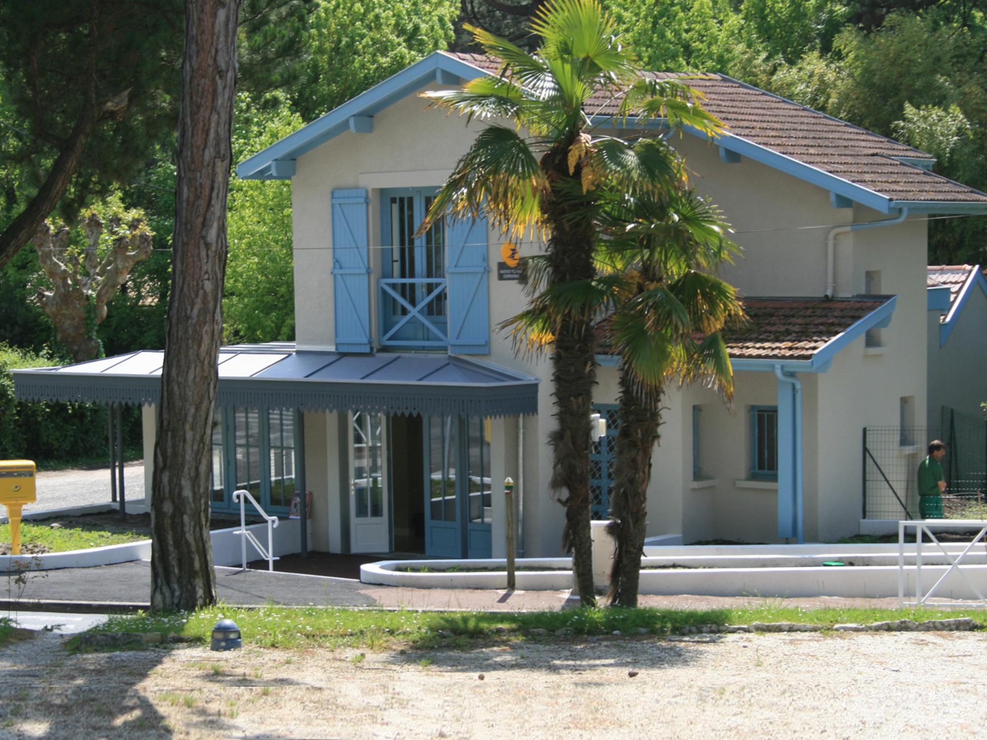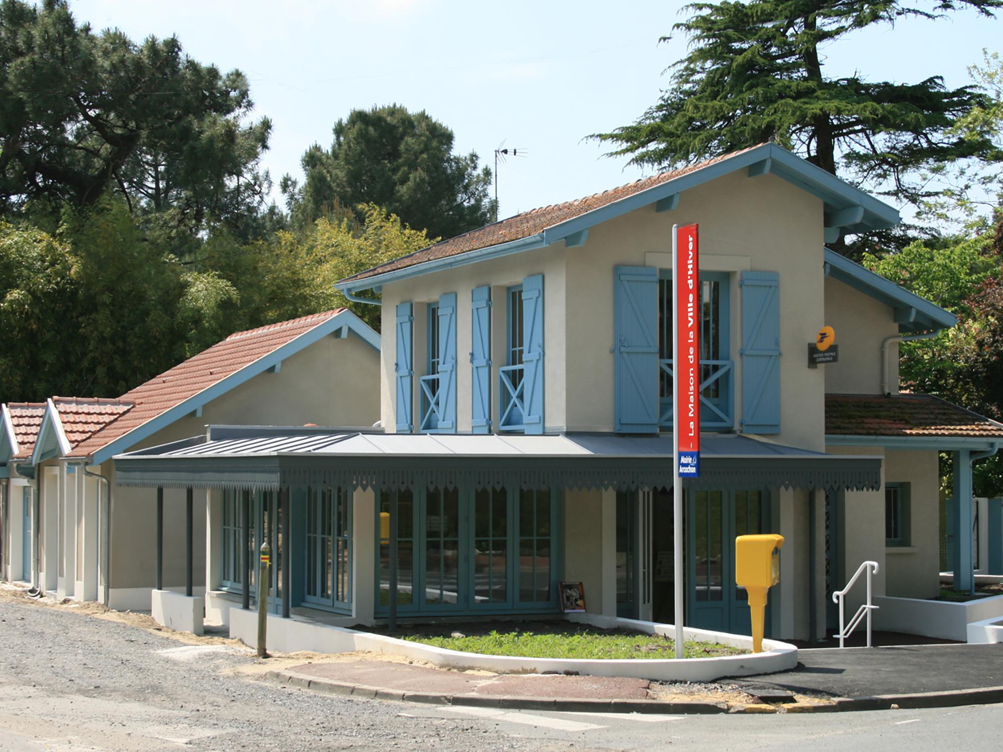 La commune d’Arcachon a fait l’acquisition d’une propriété place des Palmiers pour y établir la Maison de Quartier de la Ville d’Hiver. Le projet tire partie de l’implantation du bâtiment à l’angle de 2 rues d’importances différentes, pour déterminer les usages et les hiérarchiser. Sur la rue la plus passante, face à la place des Palmiers, l’entrée principale donne accès directement au bureau de Poste et au guichet d’Arcachon Solidaire. La salle d’expositions prend place dans la véranda à l’angle des 2 rues, tandis que la salle de réunion se glisse dans la partie du bâtiment la plus au calme, en retrait de la circulation.